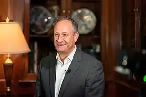 Douglas Emhoff is the husband of Kamala Harris. He was born to Jewish parents,[1] Michael and Barbara Emhoff, in Brooklyn, New York. He lived in New Jersey from 1969 to 1981, moving with his family to California when he was 17.[2][3][4] Emhoff graduated from the California State University, Northridge and USC Gould School of Law.[5] Emhoff is an entertainment litigator and began his career at Pillsbury Winthrop's litigation group. He later moved to Belin Rawlings & Badal, a boutique firm, in the late 1990s. He opened his own firm with Ben Whitwell in 2000. The firm was acquired by Venable in 2006. Emhoff is now employed by DLA Piper, working at its Washington, D.C., and California offices.[6] Emhoff was married for 16 years to film producer Kerstin Emhoff née Mackin. They have two children.[7][4] He married Harris on August 22, 2014, in Santa Barbara, California, with Harris's sister Maya Harris officiating.[8]