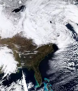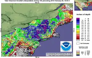 The February 25–27, 2010 North American blizzard (also known as the "Snowicane") was a winter storm and severe weather event that occurred in the Mid-Atlantic and New England regions of the United States between February 24 and 26, 2010. The storm dropped its heaviest snow of 12 to 24 inches (30 to 61 cm) (locally as much as 36 inches (91 cm)) across a wide area of interior New England, New York, and Pennsylvania. The storm also brought flooding rains to coastal sections of New England, with some areas experiencing as much as 4 inches (10 cm). Aside from precipitation, the Nor'easter brought hurricane-force sustained winds to coastal New England.[2]