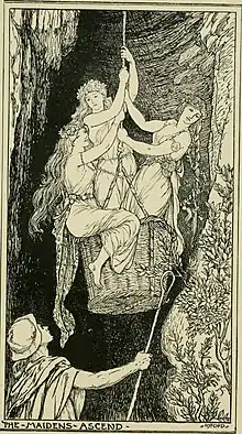 In another Hungarian tale, collected by János Erdélyi with the title Juhász Palkó[7] or Shepherd Paul, a shepherd finds a two-year-old boy in a meadow and names him Paul. He gives the boy to a ewe to suckle, and the boy develops great strength to uproot a tree after fourteen years. Paul goes to travel the world and meet three equally strong companions: Tree-Comber, Stone-Crusher and Iron-Kneader. They strike a friendship and set an arrangement: one will stay at home while the others go hunt some game. Paul's three companions stay home and are attacked by a dwarf that steals their food. Paul defeats the dwarf and ties his giant beard to a giant tree. Paul scolds his companions and wants to show them the defeated foe, but he has vanished. They soon follow him to an opening that leads underground. Paul descends, enters three castles, kills three many-headed dragons, liberates three princesses and transforms the castles into golden apples with a magic wand. The last dragon he kills was the dwarf in the surface, under a different form. Paul is betrayed by his companions, protects a nest of griffins with his cloak and their father takes him to the surface after a three-day journey. After he rests a while, the hero goes after his traitorous companions, kills them and marries the youngest princess.[8]