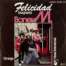 "Felicidad (Margherita)" is a 1980 single by German band Boney M., not included in any original album by the group. It returned the group to the German Top 10, peaking at #6 but was not released in either the UK or Spain. In the Netherlands, the B-side "Strange" was chosen as the A-side track. "Felicidad" and its B-side "Strange" were included in the 2 x 12" set Boney M. for Dancin' and were added as bonus tracks to the 2007 re-issue of Boney M.'s Boonoonoonoos album.
