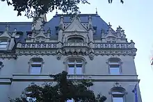 The house's main entrance is within a projecting frontispiece on 92nd Street, which contains a depressed elliptical arch at ground level, above which is a balcony with a balustrade.[85][86] According to the Real Estate Record and Guide, a driveway led from 92nd Street to this frontispiece.[87] From ground level to the top of the second floor, the center of the original Fifth Avenue elevation projects slightly, with balconies on the second and third floors.[85][88] There are rectangular windows elsewhere on the ground floor, as well as a service entrance on 92nd Street.[85][86] The fourth floor is recessed at the center and right of the 92nd Street façade. The roofline of the 92nd Street façade is also recessed at its center.[85][88] The museum's annex, designed by Kevin Roche, imitates the original mansion's style.[76][89] The façade of the annex on Fifth Avenue measures 50 feet (15 m) wide and is recessed from that of the older structure.[90]