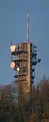The tower has a triangular form with cut edges, is 51 metres (167 ft) high and has a 22 metres (72 ft) high pole on its top. It has 16 floors and an underground building for technical equipment. The antennas are on the terraces of the 5 top floors and on the roof. For its directional radio system there are parabolic antennas, horn and shell antennas. The power for directional radio is quite small in comparison to the Uetliberg TV-tower: 10W at the maximum for a connection from Felsenegg to Chasseral of about 110 kilometres (68 mi).[3]