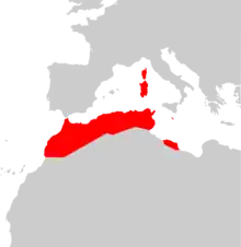 It is found in Algeria, Libya, Malta, Morocco, Tunisia, France (Corsica) and Italy (Sardinia). Its natural habitats are temperate forests, temperate shrubland, subtropical or tropical dry shrubland, Mediterranean-type shrubby vegetation, temperate grassland, caves, subterranean habitats (other than caves), arable land, rural gardens, and irrigated land. The habitat range extends to the border of the Sahara desert. In Tunisia, the species has been observed as far south as Ghomrassen or the Bou-Hedma National Park.[2]