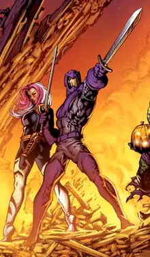 Not long afterward, it is discovered that Andreas used Arnim Zola to make a clone of his sister. Although Andreas has Andrea back, he wants to complete his Thunderbolts contract, leaving as a free man. To protect Andrea while on missions, Andreas skins his arm, giving the flesh to his sister's clone to hold and allowing her to use their shared powers.[8] Andrea accompanies her brother and the Thunderbolts during the battle against the Skrulls and witnesses as Moonstone incapacitates Andreas and attempts to make a deal with the Skrulls.[9] Andrea then attacks Moonstone. While she is preoccupied with Moonstone, Bullseye kills her from behind. Osborn later convinces Andreas that the Skrulls killed his sister's clone.[10] Andreas also saves Songbird's life when Bullseye and Venom attempt to kill Songbird on Moonstone's orders.[11] Andreas later confronts Osborn with the revelation that he wasn't offered a slot on the Dark Avengers, as well as never planning on resurrecting his sister or receiving a Presidential pardon; Osborn has a moment of insanity and stabs Andreas through the chest with his own sword, apparently killing him and throwing him out over the mountain.[12]
