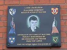 An earlier "Fianna" was organised "to serve as a Junior Hurling League to promote the study of the Irish Language" on 26 June 1902 at the Catholic Boys' Hall, Falls Road, in West Belfast, the brainchild of Bulmer Hobson.[3][4] Hobson, a Quaker influenced by suffragism and nationalism, joined the Irish Republican Brotherhood in 1904 and was an early member of Sinn Féin during its monarchist-nationalist period, alongside Arthur Griffith and Constance Markievicz.[5] Hobson later relocated to Dublin and the Fianna organisation collapsed in Belfast. Markievicz, inspired by the rapid growth of Baden-Powell's Boy Scouts,[6] formed sometime before July 1909 the Red Branch Knights, a Dublin branch of Irish National Boy Scouts.[7] After discussions involving Hobson, Markievicz, suffragist and labour activist Helena Molony and Seán McGarry, the Irish National Boy Scouts changed their name to Na Fianna Éireann at a meeting in 34 Lower Camden Street, Dublin, on 16 August 1909 (the building today marked with a commemorative plaque), at which Hobson was elected as president (thus ensuring a strong IRB influence), Markievicz as vice-president and Pádraig Ó Riain as secretary.[8] Seán Heuston was the leader of the Fianna on Dublin's north side, while Cornelius "Con" Colbert was the leader on the south side. The Fianna formed as a Nationalist alternative to Powell's Scouts with the aim to achieve the full independence of Ireland by training and teaching scouting and military exercises, Irish history, and the Irish language.[9]