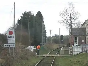 The station was opened as Finghall Lane by the Bedale and Leyburn Railway on 19 May 1856. It was closed in April 1954, but was used sporadically between 1984 and 1988 for detraining passengers on DalesRail services.[1][2] The station was used in the 1970s and 1980s by the BBC Television series All Creatures Great and Small, renamed as "Rainby Halt" for the show,[3] with the signboard advising passengers bound for Darrowby to "alight here"; no passenger trains called at the station during that time.