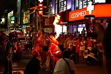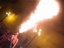 The MC Bat Commander, lead singer of the California comedy rock/New Wave/ska band The Aquabats, would regularly breathe fire to start off the band's shows during the late 1990s and early 2000s.[6] Mike Odd, the vocalist for the shock rock/horror metal band Rosemary's Billygoat, included fire breathing in the band's many outlandish stunts, alongside other forms of small-scale pyrotechnics.[7] Zoran Žikić, bass guitarist for the Serbian and Yugoslav hard rock band Kerber, used to perform fire breathing on stage. In 1984, during an open-air concert, he got second degree burns while trying to perform fire breathing under windy conditions. After this incident he was forbidden by the rest of the band members to continue performing the stunt.[8][9]