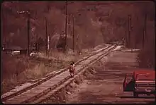 Youngsters walk on ties of railroad track that passes through Fireco (1974)