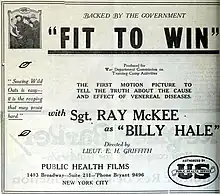 Fit to Fight is a silent sex hygiene film about the dangers of venereal disease written and directed by Edward H. Griffith.[1] It was produced by the Commission on Training Camp Activities (making it the first film to be produced by the US government)[2]: 68 and initially shown to American World War I soldiers. After the war, a slightly edited version was commercially released to the public in 1919, under the title Fit to Win. The film proved controversial due to its graphic imagery and its limited support for prophylaxis. It was subject to censorship attempts, and contributed to the emergence of the exploitation film as a distinct niche.