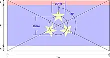 Design | The horizontal tricolour of red, blue and white colour, with three yellow five-pointed stars |