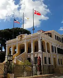 Prior to Transfer Day 1917, the Danish colonial administration used a simple flag modeled on the blue ensign with the flag of Denmark in its canton. The Danish flag is popularly said to have fallen from the sky during a 1219 battle of the Danish king Valdemar II during the Livonian Crusade against the Estonians.[3] The Nordic Cross on the flag represents Christianity.[4]