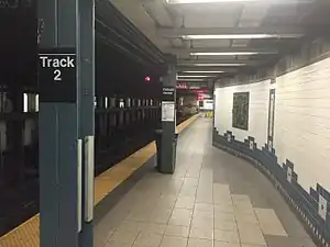 In 1981, the MTA listed the station among the 69 most deteriorated stations in the subway system.[18] As part of a plan to increase accessibility in the New York City Subway, the MTA had planned to install elevators at the Flatbush Avenue–Brooklyn College station by 1995.[19] Starting in December 1993, the station was renovated at the cost of $6 million.[20] An elevator was installed, and the 1920s-style "Flatbush Avenue" name tablets, containing red backgrounds with blue borders, were restored on both platforms.[21] The elevator was closed from July to December 2021 for replacement.[22] The top and bottom of the platform walls contain a blue solid line with a colorful border trim. This results in a tiling scheme with blue tiles that create a wavy pattern that comes farther up whenever there is a "F" tile — which stands for Flatbush — in the station's trimline.[20][23]