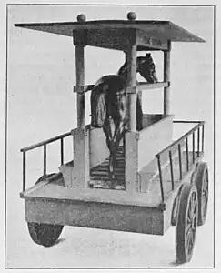 The recently founded South Carolina Canal and Railroad Company ran a competition for horse-powered locomotives in 1829. A$500 prize was offered for the best machine to be demonstrated.[1] The Flying Dutchman was a locomotive designed and built in New York in 1829 by the engineer Christian Edward Detmold.[2][1] It had a bench along either side that faced outwards, while the driving force was provided by a horse running on a treadmill in the center, connected to the axles by a series of gears. The Flying Dutchman was trialled by the railroad in 1830 and awarded the prize, having successfully carried 12 passengers at a speed of 12 miles per hour (19 km/h).[1] The Flying Dutchman was in service on a 6-mile (9.7 km) section of the railroad, within months of the first section of track being started on January 9, 1830.[3][2][4] A model of the Flying Dutchman is in the collection of the Smithsonian Institution.[1]