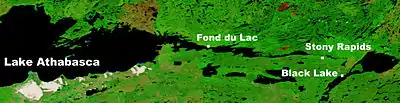 Fond du Lac Dene Nation (Chipewyan: Gánį Kóé) is a Dene First Nation located in the boreal forest area of northern Saskatchewan, Canada. The main settlement is Fond-du-Lac, situated on the east side of Lake Athabasca. It is a remote fly-in community. The population in 2011 was 874,[4] mainly of Dene and Métis descent. 705 residents selected Dene as their mother tongue in 2011.[4]