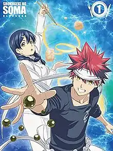 ![]() Cover art of the first Blu-ray compilation, featuring Soma Yukihira (foreground) and Megumi Tadokoro (background) | |