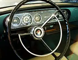 The same shape was carried over to the interior of the car where the main dials and controls on the dash-board were surrounded by a thick frame in that oval shape. The repetitious use of a single simple shape at different levels of the design gave the overall car a consistent visual unity which was in stark contrast to the high finned flamboyance of the previous Taunus 17M and was seen at the time as a radical switch by Ford of Germany away from American styling in favour of European styling.[1] There were no tails fins and there was very little decorative chrome included. The efficiency of its superficially much more simple design enabled Ford to boast that the 1960 car, despite being fractionally narrowed on the outside, offered usefully more interior width than the car it replaced.