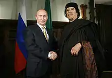 In April 2008, Putin visited Libya where he met the leader Muammar Gaddafi, the country welcomed the idea of creating an OPEC-like group of gas-exporting countries, Putin became first Russian President who visited Libya, he remarked the visit as "We are satisfied about the way in which we resolved this problem. I am absolutely convinced that the solution we have found will help the Russian and Libyan economies."[98]