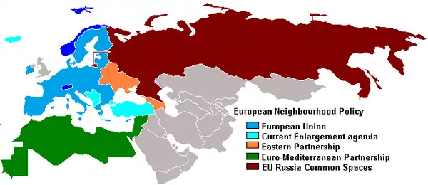 Libya is a member of the Southern Neighborhood, but has, unlike the other member states, no free trade agreement with the EU.[46] Libya is also not a member of the Union for the Mediterranean, but functions as an observer since 1999.[47] Prior to the 2011 Libyan civil war, the EU and Libya were negotiating a cooperation agreement which has now been frozen.[48] The EU worked to apply sanctions over the Libyan conflict, provide aid and some members participated in military action.[49] Since 2016, the EU has been working closely with the Libyan Coast Guard to regulate flight routes across the Mediterranean towards the EUs external border. Human rights organizations accuse the parties involved in this cooperation of serious crimes, including crimes against humanity.[50][51] Since 2016 the EU Global Strategy puts a special focus on the North African countries, of which Libya is often seen playing an important role for prosperity and security in the Mediterranean region.[52][53] In 2020 the EU was Libya's most important trade partner.[46] |