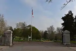 The Forest Cemetery Entrance is a historic structure located in Oskaloosa, Iowa, United States. It was designed by Frank E. Wetherell and built in 1915. While he was known for his buildings, he was also involved with civic improvement projects in Des Moines that included the beautification of the banks along the Des Moines River. This included a series of walls and walkways, and planning new thoroughfares to ease traffic congestion.[2] The two pillars are composed of rusticated grey Barre Granite. They have name of the cemetery, "Forest," carved on them. Walls extend from the pillars and include openings for sidewalks. They end at iron fences. It was listed on the National Register of Historic Places in 1991.[1]