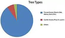 Almost half of Kosovo's entire territory is a forested area, thus leading to a satisfying extent of annual forest growth. The 40 million m3 of wood is annually increased by about 1.3 million m3, or about 3 m3 per hectare. On the other hand, the annual national demand for wood is believed to be approximately 1 million m3.[15] This enormous demand is due to firewood being the most common heating source throughout the entire country. The Kosovar forest are thus enlarged by 300,000 m3 of wood each year, whereas the global forests are in decline.[16]
