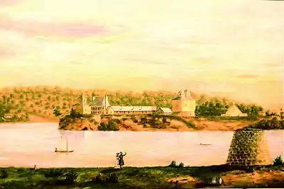 Fort Armstrong (1816–1836), was one of a chain of western frontier defenses which the United States erected after the War of 1812. It was located at the foot of Rock Island, in the Mississippi River near the present-day Quad Cities of Illinois and Iowa. It was five miles from the principal Sac and Fox village on Rock River in Illinois. Of stone and timber construction, 300 feet square, the fort was begun in May 1816 and completed the following year. In 1832, the U.S. Army used the fort as a military headquarters during the Black Hawk War. It was normally garrisoned by two companies of United States Army regulars. With the pacification of the Indian threat in Illinois, the U.S. Government ceased operations at Fort Armstrong and the U.S. Army abandoned the frontier fort in 1836.