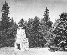 As of 2012, the Fort Drummond site is private property, and the site is only viewable from the water.[16] At least one of the remaining chimneys has been incorporated into a cabin.[17] The Fort Drummond site contains 74 features, most of which are the remains of chimneys and structural platforms. There are also two wells, two wharves, and a cemetery.[2] Faint traces of foundations can still be seen.[17]