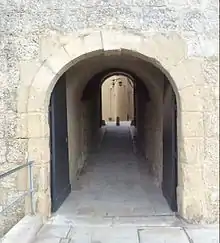 The two gates into the city, Mdina Gate and Greeks Gate, are located within the curtain walls of the land front.[47][48] Remains of the medieval double walls as well as the 18th-century Torre dello Standardo are located just within the city walls.[16][49] The land front is surrounded by a deep ditch,[35] and a traverse-like battery is located in its eastern extremity.[50]