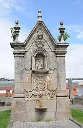 The fountain in located in an urban environment, situated on the northeast corner of the Praça da República, with a small landscaped area, with pavement running parallel.[1] The zone is delimited by a masonry wall with stone bunks, which constitutes a small lookout over the residences of the town, and the Minho valley.[1]