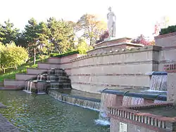 - The Fontaines de la Porte de Saint-Cloud, Place Port de Saint-Cloud, 16th arrondissement (1936). Paul Landowski, sculptor, and Robert Pommier and Jacques Billiard, architects. The monumental fountains were made to fill a vast square created in 1926 for a tramway and railway station and meeting point of seven avenues, where the old gates and fortifications of the city had been. The central features were two cylindrical columns, fifteen meters high, spouting water and covered with bas-reliefs, and illuminated at night, designed to serve as a symbolic entrance to the city. Their creator, the sculptor Paul Landowski, wrote, "these are the first fountains in Paris in which the effects of light, architecture and sculpture were joined from the very beginning."[42]