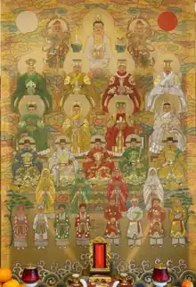 The pantheon of Four Palaces includes the following ranks. While the hierarchy and names of the ranks are widely recognized and agreed upon, each rank might have some variations which include a different number of deities or a deity could have various stories and biographies. The belief is that a deity could manifest in various historic figures.