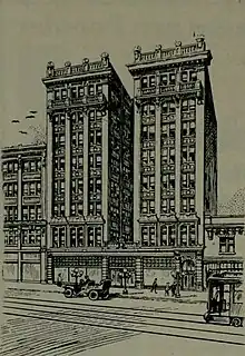 Office tenants over the years included the American Silk Factors (at 714),[6] the Ray F. Coyle Company (with offices at 725 and 726),[7] the McAlpine Gold Mining and Milling Company (at 820),[8] the Moore Mill & Lumber Company,[9] and architect firm H. H. Larsen & Son.[10] Earl Baldwin Bertz, later primary architect of the Allen & Co., moved into an office at the Foxcroft Building in 1918, working for insurance broker and developer John Brickell.[11]