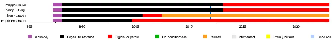 All four defendants received life imprisonment, with a chance of parole after 30 years for Philippe Siuave and Thierry El Borgi, 15 for Thierry Jaouen and 13 for Franck Feuerstein.