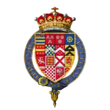 Rutland married firstly, on 6 May 1602, Frances Knyvet (died before 26 November 1605), (third daughter and coheir of Sir Henry Knyvet of Charlton, Wiltshire[8] and Elizabeth, the daughter of Sir James Stumpe of Bromham, Wiltshire),[9][10] and widow of Sir William Bevill of Killigarth or Kilkhampton, Cornwall.[11] They had a daughter, Katherine, who on 16 May 1620 married George Villiers, 1st Duke of Buckingham. After Buckingham's death, Katherine married Randal MacDonnell, 1st Marquess of Antrim.[1][5][12]
