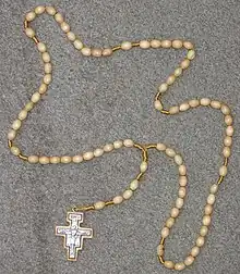The Franciscan Crown (or Seraphic Rosary) is a rosary consisting of seven decades in commemoration of the Seven Joys of the Virgin, namely, the Annunciation, the Visitation, the Nativity of Jesus, the Adoration of the Magi, the Finding in the Temple, the Resurrection of Jesus, and finally, either or both the Assumption of Mary and the Coronation of the Virgin. Devotion to the seven joys of Mary is found in a variety of forms and communities. It is especially popular with the Franciscans, Cistercians, and the Annunciades of St. Joan of France. The devotion was granted many indulgences by different popes, becoming the most heavily indulgenced devotion in the Catholic Church. In order for any associated indulgences to be received it was not necessary for a Franciscan rosary to have been blessed or even to use beads at all.[1]