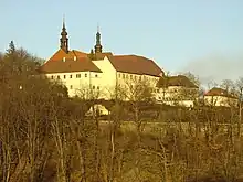 The Franciscan Monastery (Czech: Františkánský klášter) lies on the edge of the town of Kadaň, Czech Republic and near the river Ohře. Its history dates back to the 15th century. It is now the seat of the Municipal Museum of Kadaň with an exposition of life in a monastery. The church's dedication to the Fourteen Holy Helpers shows the connection to then popular German shrines of the same cult. Around the building is a beautiful vineyard, a French park and many plum trees. The monastery was ranked among the national cultural monuments by the Ministry of Culture of the Czech Republic in 1995. The monastery faces the Úhošť hill on the opposite slope of the Ohře valley.
