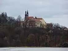The Franciscan Monastery (Czech: Františkánský klášter) lies on the edge of the town of Kadaň, Czech Republic and near the river Ohře. Its history dates back to the 15th century. It is now the seat of the Municipal Museum of Kadaň with an exposition of life in a monastery. The church's dedication to the Fourteen Holy Helpers shows the connection to then popular German shrines of the same cult. Around the building is a beautiful vineyard, a French park and many plum trees. The monastery was ranked among the national cultural monuments by the Ministry of Culture of the Czech Republic in 1995. The monastery faces the Úhošť hill on the opposite slope of the Ohře valley.