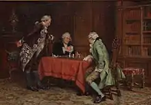 His historical genre paintings are particularly popular. They were complemented by his accurate knowledge of period costume and furnishings. Bennett had a large collection of Eighteenth and early Nineteenth Century costumes. An impressive example from the collection is seen worn by the man on the left-hand side in the painting Nearing the end. The garment is also illustrated in the biographical book 'Frank Moss Bennett, 1874-1952, (The Forgotten Artist)' and it is currently in the costume collection of The Colonial Williamsburg Foundation, Virginia, USA.[9] Where it is described as