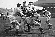 ![]() Eric Batten (left) and Ken Traill assist as Bradford Northern's Frank Whitcombe tackles Warrington's Jim Featherstone (№ 11) and Herbert Smith (right) looks on during Bradford Northern's 5-15 defeat by Warrington in the Championship Final during the 1947–48 season at Maine Road, Manchester, on Saturday 8 May 1948 | ||||||||||||||||||||||||||||||||||||||||||||||||||||||||||||||||||||||||||||||