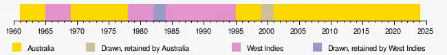 As of 2022, Australia hold the trophy following their 2–0 series victory in the West Indies 2022–23 tour.[10] Australia also lead in overall wins, winning 15 of the 25 series, while the West Indies have won 8, the remaining 2 ending in draws (with the trophy being retained by the incumbents).[1][2] Brian Lara is the most successful batsman in the history of the trophy, scoring 2,815 runs for the West Indies in 56 innings at an average of 52.12.[3] He also holds the record for the highest score (277) which he made in the third Test at the Sydney Cricket Ground during the 1992–93 series.[11] West Indian fast bowler Courtney Walsh has taken the most wickets in the trophy, with 135 over 38 matches, at an average of 28.68,[4] while Australia's Graham McKenzie has the best bowling figures of 8 wickets for 71 runs, achieved in the second Test of the 1968–69 series.[11] Australian Mark Waugh has taken the most catches, with 45 in 28 matches,[12] while West Indian Jeff Dujon is the most successful wicketkeeper, making 84 dismissals in 23 matches.[13]