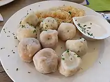The sauce accompanying the knödel is made with grated Styrian kren, mix with sour cream, vinegar, salt and chives.[6]