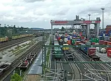 After the closure of the central Frankfurt freight yard, the Frankfurt East station became the centre of freight handling in Frankfurt. The freight yard was expanded from about 2003 to house a container terminal. A large area to the east of the station (which had previously been used for the Frankfurt Main East railway workshop) was redeveloped as a storage space for containers and transport vehicles along with arrival and departure routes to the road network. Complete freight trains are run from the East station yard mainly for the automotive and mining industries.