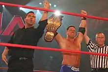 At the 2007 Turning Point pay-per-view, he was partnered with Booker T against Christian Cage and Robert Roode, with Kaz and Booker winning.[33] He then began attacking Dustin Rhodes, and stealing things from Rhodes' alter ego "Black Reign". He defeated Black Reign at Final Resolution.[34] After defeating Black Reign, Kaz and Black Reign competed in a Four Corner Mouse Trap match were Kaz won but Black Reign ended up getting his things back from Kaz after hitting Kaz with his Darkness Falls weapon. On February 23, Kaz defeated Rellik. After the match, Black Reign and Rellik attacked Kaz. Eric Young ran out to help but got too scared to do anything. At Destination X, Kaz and Young defeated Black Reign and Rellik leading to Kaz and Young (now 'Super Eric') becoming a tag team.[35] On April 13, at Lockdown 2008, they won the Cuffed in a Cage match.[36] On the April 17 episode of TNA Impact!, following Lockdown, Kaz and Young defeated the holders of the TNA World Tag Team Championship, AJ Styles and Tomko and The Latin American Xchange (LAX) in a triple threat tag team match for the titles after Young's alter ego, "Super Eric" pinned Styles with a bridging suplex.[37] Later in the night, Styles complained to Jim Cornette that since Young was signed to the match, not Super Eric, and Young claimed that he and Super Eric are different people, Super Eric's involvement was outside interference.[37] When Eric refused to admit that he was Super Eric, Cornette vacated the titles.[37]
