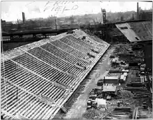 The current stadium structure was built in the 1920s, designed by Day & Klauder, after the original wooden bleachers were torn down. The lower tier was erected in 1922. The old wood stands were razed immediately following the Penn Relays and the new concrete lower tier and seating for 50,000 were built.[10] The second tier was added in 1925, again designed by Day & Klauder, when it became the second (and the largest) two-tiered stadium in the United States.[11]
