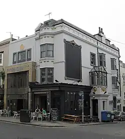 The inn existed by the 1850s, according to census information; its first landlord, Thomas Lindfield from Egham in Surrey, passed it on to his son John, who sold it in the mid-1870s.[12] The next landlord was also long-serving, but ownership changed more frequently from the late 1890s onwards.[13] The incumbent in 1928 was Frank Dickerson; at this time the recently incorporated Kemp Town Brewery of Kemp Town, Brighton, took ownership of the pub and decided to refit and extend it to include a restaurant.[3][13] They commissioned John Leopold Denman of Denman & Son to carry out the work.[2] The firm was used regularly by the Kemp Town Brewery for pubs along the Sussex coast, and also undertook much work on offices and other commercial developments. Denman's preferred style for these buildings was Neo-Georgian, although he and his son were capable of handling other styles effectively.[14] Their design for the restaurant was highly elaborate inside and out, and was based on the Art Deco style popular at the time. The entrance was framed by a two-storey mosaic of blue and gold pieces adorned with Masonic symbols, the Star of David and bizarre griffin-like creatures.[3][13] A partly glazed curved screen led inwards to an Art Deco interior with integral furniture.[3]