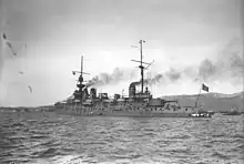 With an initial budget of 41,565,620 French francs,[4] Justice was laid down at the La Seyne shipyard in Toulon on 1 April 1903, launched on 27 October 1904, and completed on 15 April 1908.[5] This was over a year after the revolutionary British battleship HMS Dreadnought entered service, which had rendered pre-dreadnoughts like Justice outdated.[6] After commissioning, Justice was assigned to the 2nd Division of the Mediterranean Squadron, serving as its flagship, along with her sisters Liberté and Vérité.[7] Contre-amiral (CA—Rear admiral) Jules Le Pord was the divisional commander at that time, and he came aboard the ship on 16 April. Beginning on 10 June and lasting into July, the Mediterranean and Northern Squadrons conducted their annual maneuvers off Bizerte. The 2nd Division ships visited Bizerte in October. On 30 December, Justice, Vérité, and the destroyers Carquois and Fanfare carried relief aid to Messina, Sicily to help survivors of an earthquake there.[8]