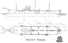 Duguay-Trouin was an iron-hulled vessel that was 88 m (288 ft 9 in) long at the waterline and 90.15 m (295 ft 9 in) long between perpendiculars, with a beam of 13.2 m (43 ft 4 in). She had an average draft of 5.64 m (18 ft 6 in) on a displacement of 3,662 t (3,604 long tons; 4,037 short tons) as designed. The ship had a ram bow and an overhanging stern. Her hull was sheathed with wood to protect them from marine biofouling on long voyages overseas, and she was divided into nine watertight compartments, along with a double bottom. The ship rolled badly, but otherwise handled well. Her crew amounted to 311–322 officers and enlisted men.[2][7]