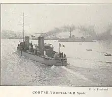 Spahi was ordered from Forges et Chantiers de la Méditerranée and was launched at their shipyard in La Seyne-sur-Mer on 3 May 1908. She was completed in July 1910.[4] When the First World War began in August 1914, Spahi was assigned to the 2nd Destroyer Flotilla (2e escadrille de torpilleurs) of the 1st Naval Army (1ère Armée Navale). During the preliminary stages of the Battle of Antivari, Montenegro, on 16 August, the 1st, 4th and 5th Destroyer Flotillas were tasked to escort the core of the 1st Naval Army while the 2nd, 3rd and 6th Flotillas escorted the armored cruisers of the 2nd Light Squadron (2e escadre légère) and two British cruisers. After reuniting both groups and spotting the Austro-Hungarian protected cruiser SMS Zenta and the destroyer SMS Ulan, the French destroyers played no role in sinking the cruiser, although the 4th Flotilla was sent on an unsuccessful pursuit of Ulan. Having broken the Austro-Hungarian blockade of Antivari (now known as Bar), Vice-Admiral (Vice-amiral) Augustin Boué de Lapeyrère, commander of the 1st Naval Army, decided to ferry troops and supplies to the port, escorted by the 2nd Light Squadron and the 1st and 6th Destroyer Flotillas while the rest of the 1st Naval Army bombarded the Austro-Hungarian naval base at Cattaro, Montenegro, on 1 September. Four days later, the fleet covered the evacuation of Danilo, Crown Prince of Montenegro to the Greek island of Corfu. The 2nd Flotilla bombarded Stončica Lighthouse on the island of Lissa on 19 September. The flotilla escorted multiple small convoys loaded with supplies and equipment to Antivari, beginning in October and lasting for the rest of the year, always covered by the larger ships of the Naval Army in futile attempts to lure the Austro-Hungarian fleet into battle. The Naval Army raided Lissa and the island of Lastovo on 2 November with the destroyer Lansquenet entering Vis harbor and extorting a ransom from the townsmen lest the French bombard the town. As they departed, the French shelled the lighthouse again.[5]