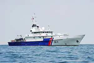 Thémis carries out fishing control and marine environment protection operations in the Exclusive economic zone of France of the Eastern Channel - North Sea maritime zone. She carries out checks to prevent pollution due to exploration or exploitation operations of the seabed or subsoil.[1] It bears the AEM (State Action at Sea, French: Action de l'État en mer)[2] marking on its bow, the three inclined blue, white and red bands.