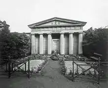 The site of the Friedenspark used to be occupied by the Neuer Johannisfriedhof, which was opened as the second city cemetery of Leipzig in 1846, after it had proved impossible to enlarge the old cemetery, the Alter Johannisfriedhof, any further. The designs for the chapel and mortuary, built between 1881 and 1884, were by Hugo Licht (1841–1923). They were destroyed in World War II. During the time of the National Socialist government the remains of more than a hundred children from the Paediatrics Department of the Dösen Asylum were buried anonymously in urns in sections V 2, 3 and 5, victims of the then child euthanasia policy.[1]