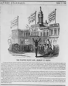 Several years before, in the Jerry Rescue, Syracuse abolitionists freed by force a fugitive slave who was to be sent back to the South and successfully smuggled him to Canada.[21] Thomas Sims and Anthony Burns were both captured fugitives who were part of unsuccessful attempts by opponents of the Fugitive Slave Law to use force to free them.[22] Other famous examples include Shadrach Minkins in 1851 and Lucy Bagby in 1861, whose forcible return has been cited by historians as important and "allegorical".[23] Pittsburgh abolitionists organized groups whose purpose was the seizure and release of any enslaved person passing through the city, as in the case of a free Black servant of the Slaymaker family, erroneously the subject of a rescue by Black waiters in a hotel dining room.[7] If fugitives from slavery were captured and put on trial, abolitionists worked to defend them in trial, and if by chance the recaptured person had their freedom put up for a price, abolitionists worked to pay to free them.[24] Other opponents, such as African-American leader Harriet Tubman, treated the law as just another complication in their activities.